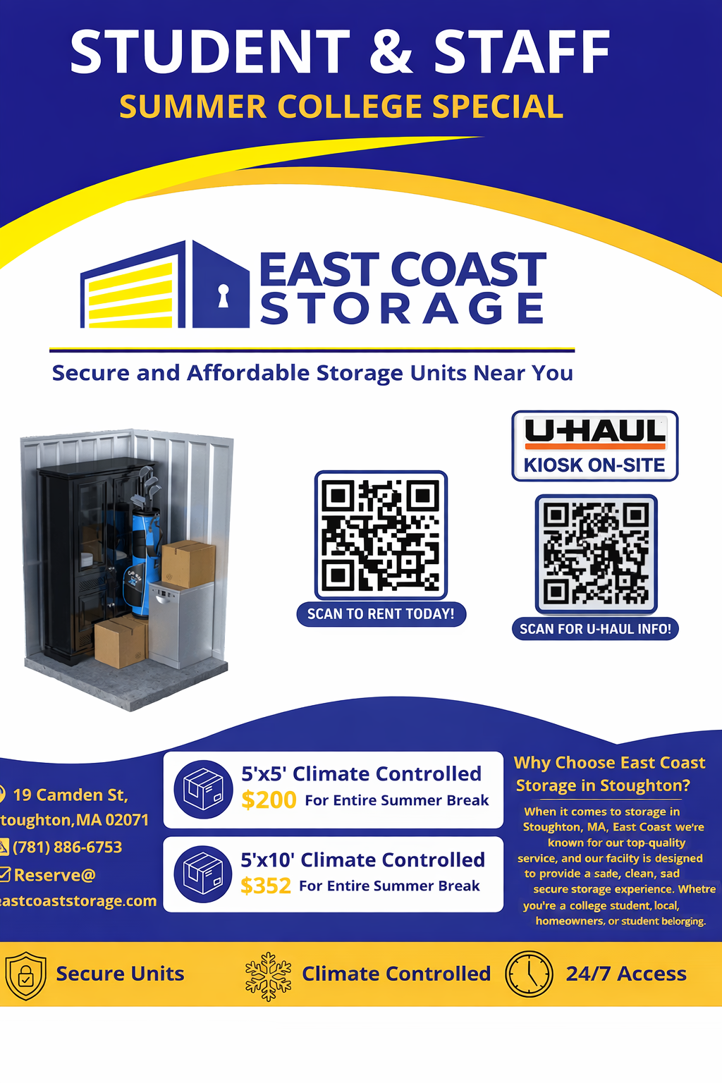 Residence Life does not provide storage on campus for personal items at any time. If you need to store items near campus, for a few weeks, or a few months, we recommend the following options: